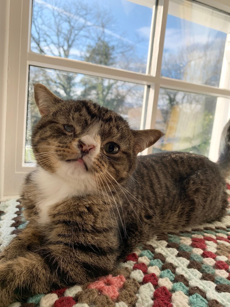 Arlo the cat, with his misshapen head,
